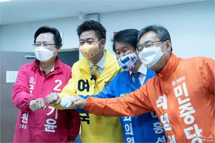 창원성산에 후보등록을 마친 미래통합당 강기윤, 정의당 여영국, 민주당 이흥석, 민중당 석영철 후보가 공명선거를 다짐하며 포즈를 취하고 있다. (사진=이상현 기자)