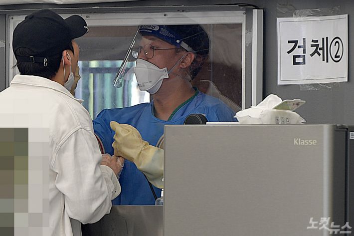 지난 13일 서울 용산구 한남동 주민센터 옆 공영주차장에 설치된 워크스루(walkthrough) 방식 선별진료소에서 시민들이 검체 검사를 받고 있다. (사진=박종민 기자/자료사진)