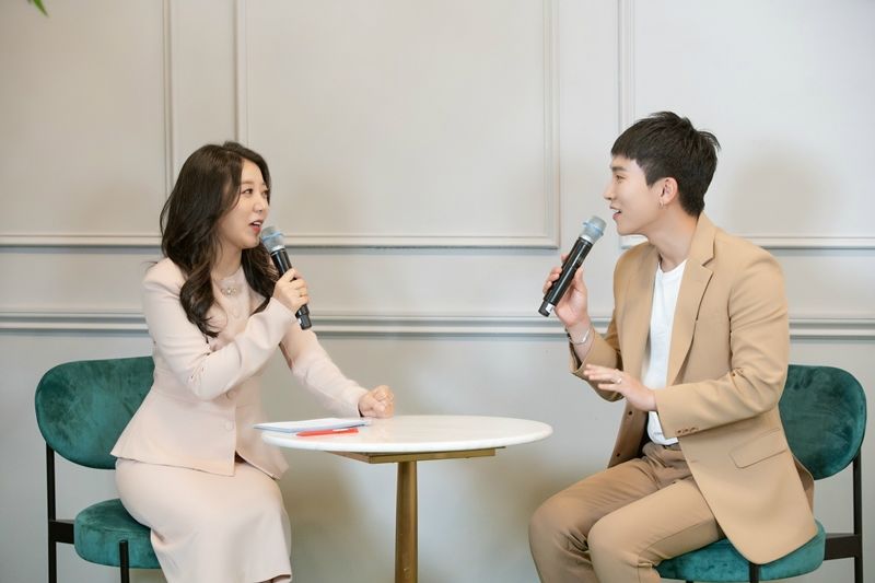 서은광이 이날 온라인 음악 감상회 MC를 본 하지영(왼쪽)과 함께 이야기 나누고 있다. (사진=큐브엔터테인먼트 제공)