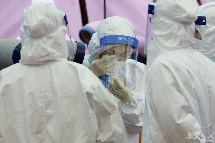 서울을 비롯한 수도권에 폭염주의보가 발효된 22일 오후 서울 강서구 보건소 선별진료소에서 의료진이 땀을 닦고 있다. (사진=이한형 기자/자료사진)