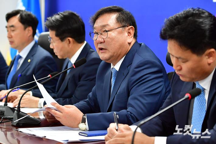 더불어민주당 김태년 원내대표가 25일 오전 국회 의원회관에서 열린 당 정책조정회의에서 모두발언을 하고 있다.