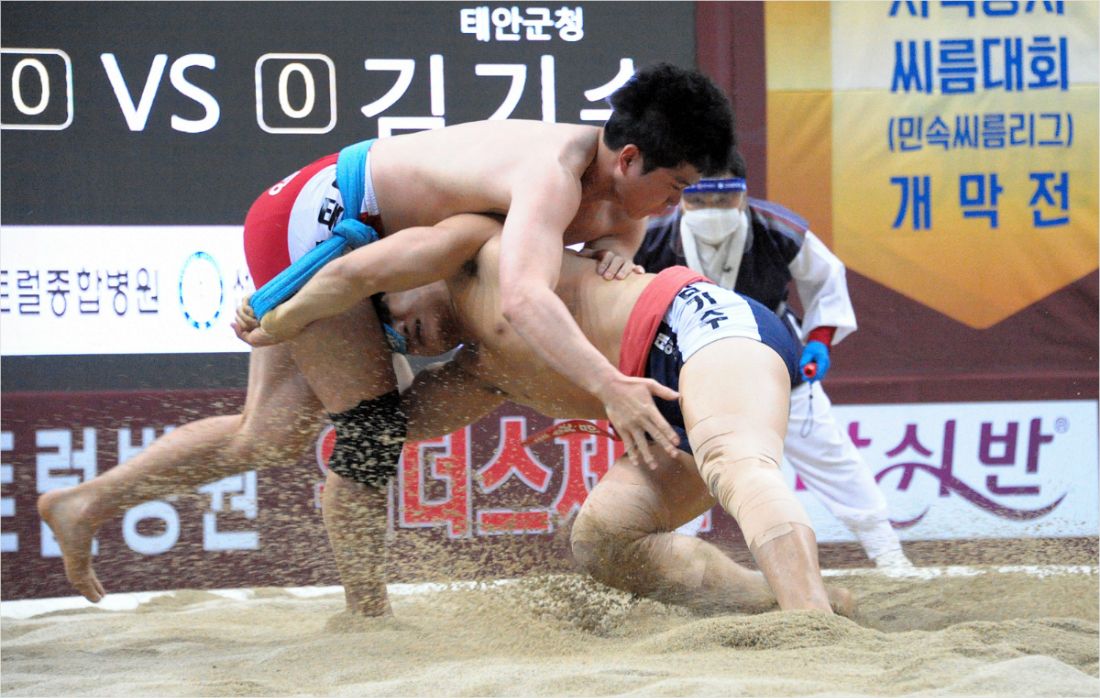 임태혁(왼쪽)이 12일 영월장사씨름대회 금강급 결승전에서 뒤집기를 시도하는 김기수를 끌어치기로 눕히고 있다.(사진=대한씨름협회)