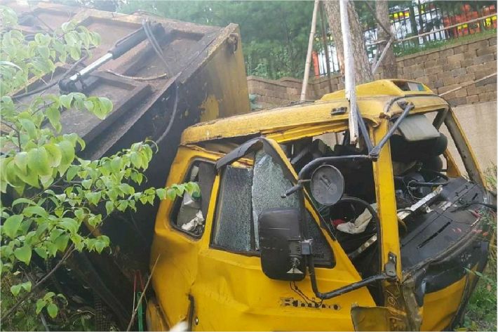 23일 오전 7시 4분쯤, 동래구 명륜동 한 아파트 후문 입구 화단에서 정차해 있던 4톤청소 트럭이 3m아래 화단으로 추락했다.