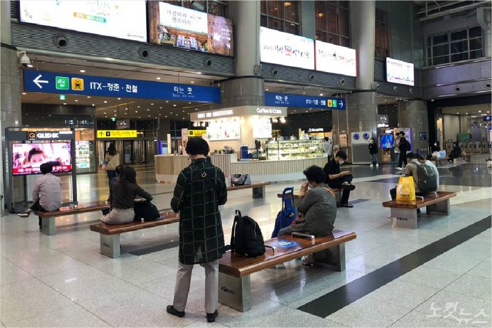 뉴스가 흘러나오는 TV 앞 대기석은 1~2m '거리두기'를 일부러 할 필요 없을 정도로 착석한 시민이 많지 않았다. 띄엄띄엄 앉아서 예매한 기차를 기다리는 승객들 중에는 커피와 간식거리를 먹으며 이야기를 나누는 이들도 드문드문 눈에 띄었지만, 북적대고 활기찼던 예년과 달리 대체로 차분한 분위기를 유지했다.