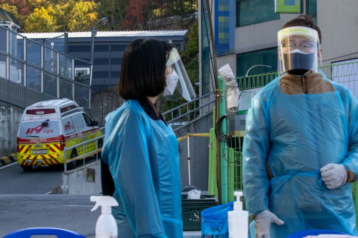지난 23일 신종 코로나바이러스 감염증(코로나19) 집단감염이 발생한 요양원이 있는 오남읍 한 건물로 구급차가 들어가고 있다.(사진=연합뉴스)