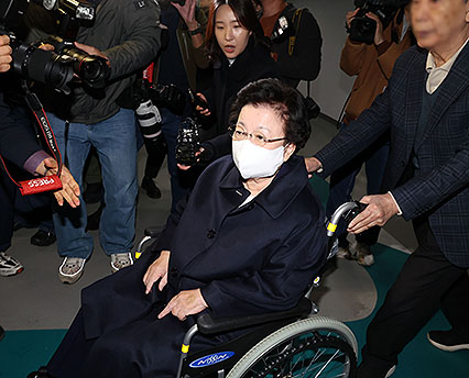 이날 고개를 숙이고 하늘색 수의에 휠체어를 타고 나와 피고인석에 자리한 이 교주는 3시간 넘게 진행된 재판 내내 별다른 말을 하지 않았다. 그는 최근 2번 치러진 공판기일에 출석하지 않은 이유에 대해 "병원에서 치료를 받다가 그랬다. 정신이 없었다"고 밝혔다.