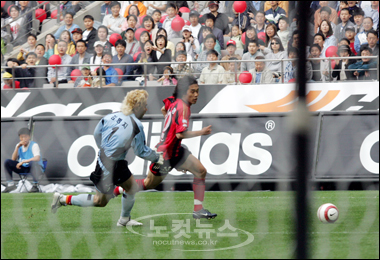 FC서울 박주영이 8일 상암월드컵경기장에서 열린 프로축구 포항 스틸러스와의 경기에서 김병지 골키퍼를 제치고 있다.(한대욱기자/노컷뉴스)