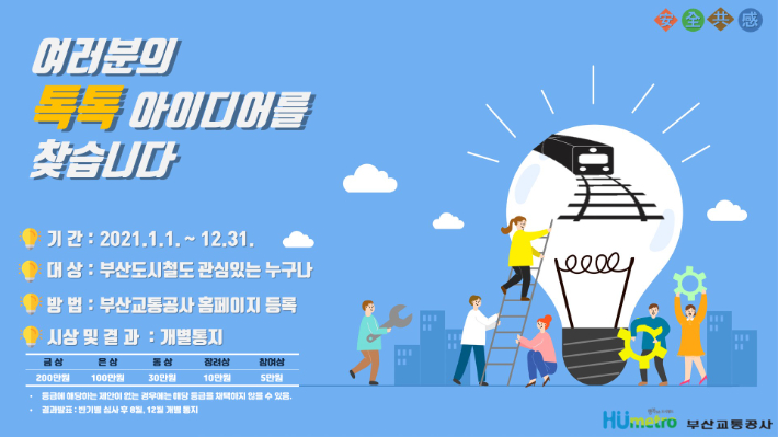 부산교통공사는 도시철도 관련 시민 아이디어를 반영하기 위해 '시민톡톡아이디어' 공모전을 실시한다고 26일 밝혔다.