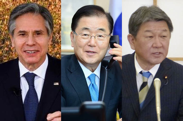 왼쪽부터 토니 블링컨 미국 국무장관, 정의용 외교부장관, 모테기 도시미쓰 일본 외무장관. 연합뉴스