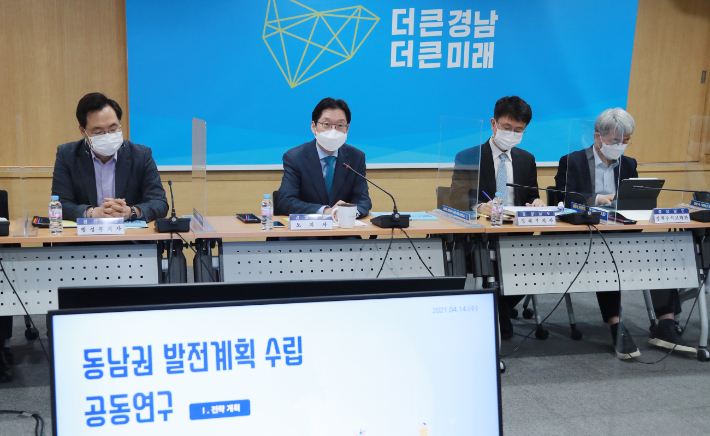 경상남도는 14일 부울경 메가시티 조성의 지표가 될 '동남권 발전계획 수립 공동연구' 결과 보고회를 열었다. 김경수 지사를 비롯해 홍재우 경남연구원장과 연구진 등이 참석했다.