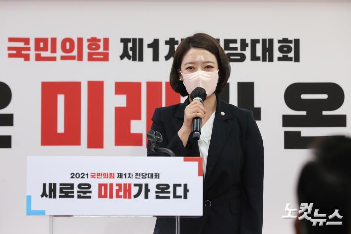 국민의힘 최고위원에 당선된 배현진 의원이 11일 서울 여의도 당사에서 열린 제1차 전당대회에서 당선자 수락연설을 하고 있다.