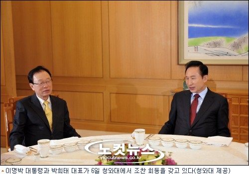 한나라당의 4.29 재보선 참패 이후 마련된 이명박 대통령과 박희태 대표 등 한나라당 지도부와의 조찬 회동은 밝은 분위기로 시작됐다.