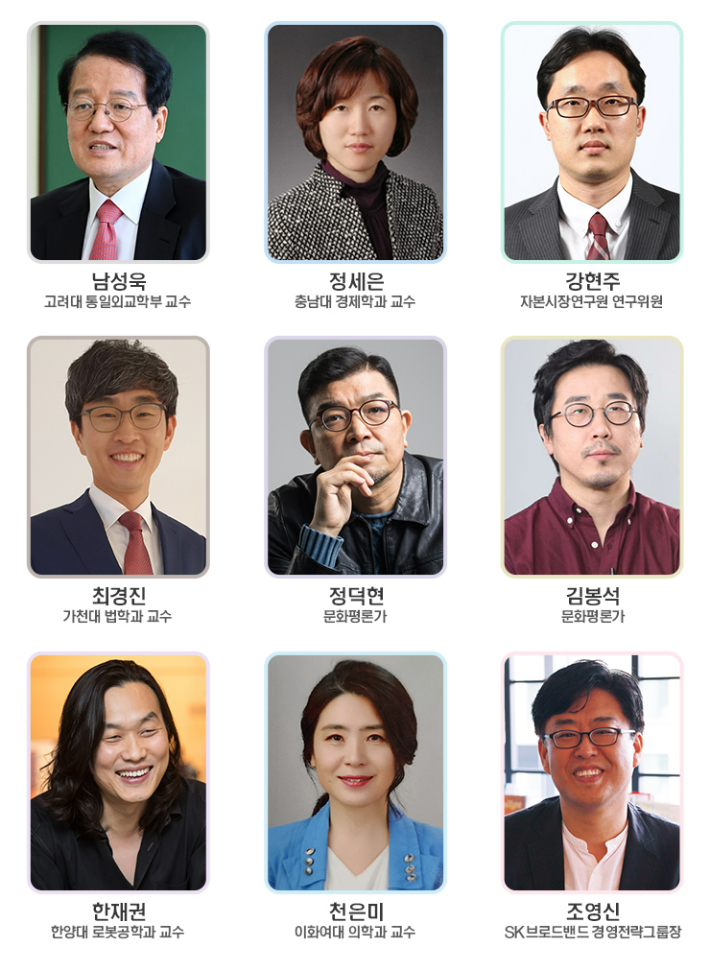 필진은 △남성욱 고려대 통일외교학부 교수 △정세은 충남대 경제학과 교수 △강현주 자본시장연구원 연구위원 △최경진 가천대 법학과 교수 △김봉석 문화평론가 △정덕현 문화평론가 △한재권 한양대 로봇공학과 교수 △천은미 이화여대 의대 교수 △조영신 SK브로드밴드 그룹장입니다.