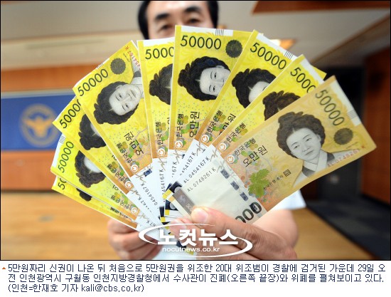 한편 5만원짜리 신권 위조지폐가 벌써 등장해 혀를 내두르게 하고 있다. 위조범들은 신권이 발행된 첫날 5만원권을 구해서 칼라복사기로 266장을 위조한 혐의를 받고 있다.