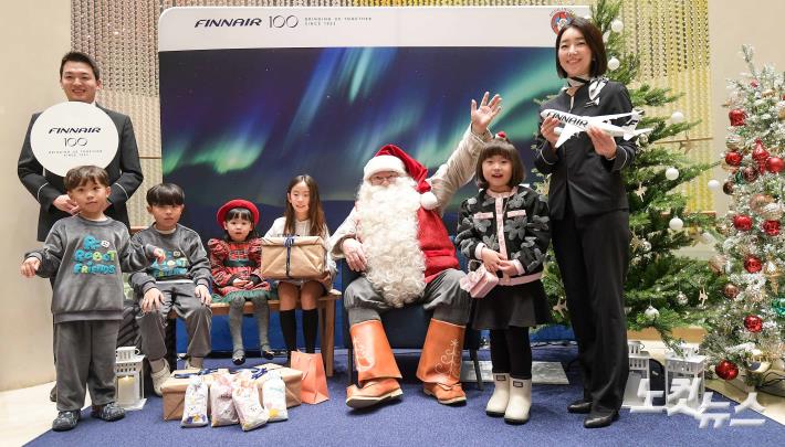11일 서울 중구 신세계백화점 본점에서 열린 핀에어, 핀란드 공식 산타클로스와 '밋엔그릿'(Meet & Greet) 행사에서 산타클로스와 어린이가 포즈를 취하고 있다