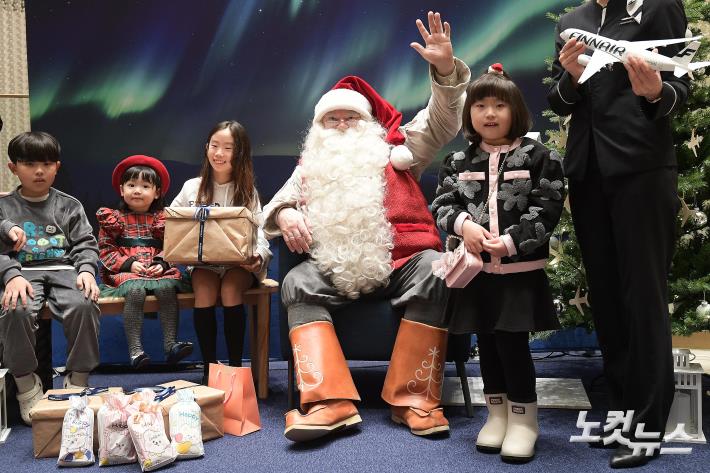11일 서울 중구 신세계백화점 본점에서 열린 핀에어, 핀란드 공식 산타클로스와 '밋엔그릿'(Meet & Greet) 행사에서 산타클로스와 어린이가 포즈를 취하고 있다