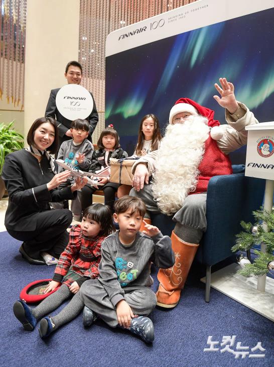 11일 서울 중구 신세계백화점 본점에서 열린 핀에어, 핀란드 공식 산타클로스와 '밋엔그릿'(Meet & Greet) 행사에서 산타클로스와 어린이가 포즈를 취하고 있다