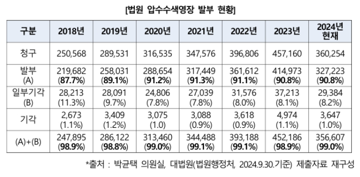 ◇ 손수호> 그런데 이런 압수수색 영장의 발부율이 거의 100%다, 99%에 이른다. 이 정도면 그냥 청구하면 다 나온다 이렇게 봐야 되는 거 아닙니까?