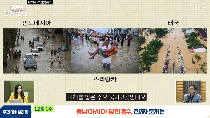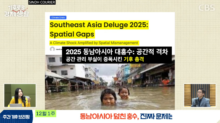 ◇ 최서윤> 그렇죠. 아수라장일 거예요. 말 그대로 광역 수해가 발생했다고 보시면 됩니다. 동남아시아가 원래 지구상의 기후변화에 가장 취약한 지역 중 하나로 꼽히잖아요. 이번 대규모 피해 원인에 기후변화가 또다시 거론되고 있어서 관련 이야기를 해 보려고 합니다.