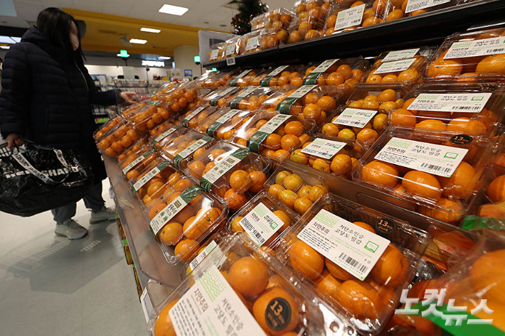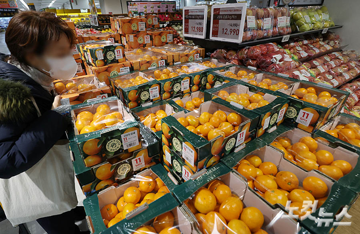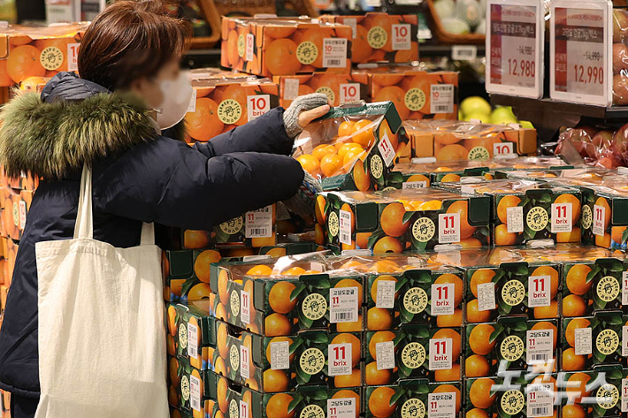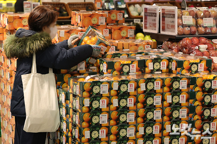 귤, 사과 등 신선과실과 쌀을 비롯한 곡물 가격이 큰 폭으로 오르며 서민들의 장바구니 물가 부담이 커진 가운데 8일 서울의 한 대형마트에서 시민들이 과일을 구매하고 있다.