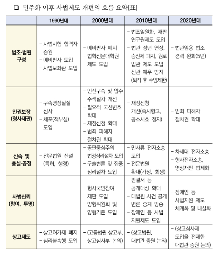 1990년대 김영삼 정부 당시 사법개혁 요구의 핵심은 '사법의 민주화'였다. 비민주·권위주의적 요소를 타파하고 국민의 기본권을 보장을 강화해 민주적 질서를 확립할 수 있는 사법제도 개편을 추구했다.