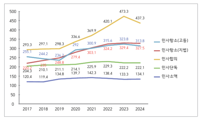 1심 민사합의 사건의 평균처리기간은 2017년 293.3일에서 2024년 437.3일로 49% 증가했다. 지방법원의 민사항소 사건 역시 2017년 220.2일에서 2024년 327.5일로 48% 늘었다.