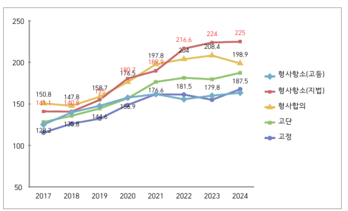 국민을 위한 사법제도 개편 공청회 : 방향과 과제 자료집형사 사건의 경우도 마찬가지다. 1심 형사합의는 2017년 150.8일에서 2024년 198.9일로 31% 증가했다. 1심 형사단독(고단) 사건은 2017년 128.2일에서 2024년 187.5일로 46% 증가했다. 특히 지방법원 형사항소심 사건은 2017년 141.1일에서 2024년 225.0일로 59% 늘었다.