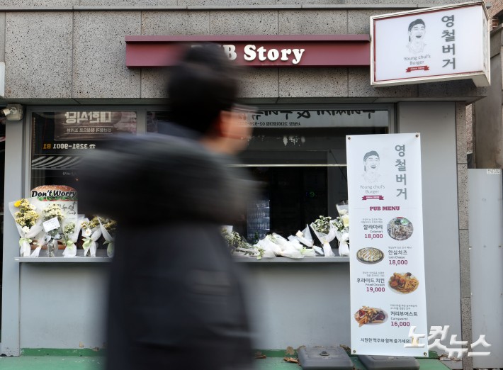 15일 서울 성북구 안암동 고려대 인근 영철버거 앞에 영철버거 대표 이영철 씨를 추모하는 꽃이 놓여 있다. 이 씨는 학생들과의 ‘1000원 약속’을 지키기 위해 재료 가격이 치솟아 버거 하나를 팔 때마다 수 백 원 적자가 날 때도 가격을 유지했다. 2004년부터는 고려대에 수차례 2000만 원씩 기부했다. 그러다가 경영난으로 2015년 폐업했을 땐, 고려대 학생들의 모금 활동으로 2주 만에 6800만 원이 모였고 이 씨는 영철버거 영업을 이어갈 수 있었다. 고려대는 장례식 비용을 전액 지원하고 고인의 이름으로 장학금을 신설하기로 했다.