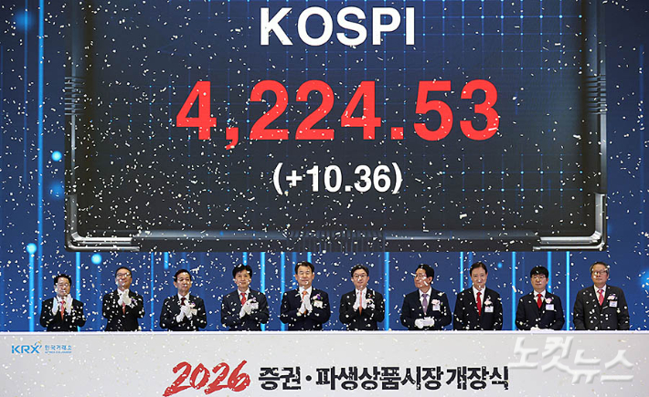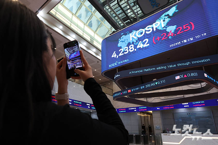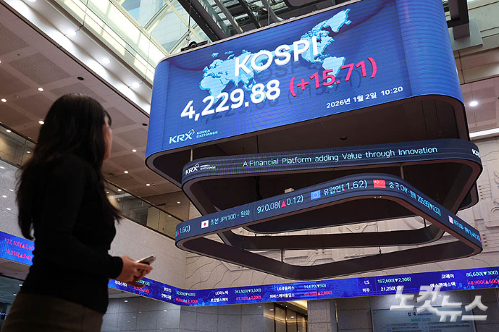 2일 서울 여의도 한국거래소 현황판에 코스피가 표시돼 있다. 2026년 첫 거래일인 이날 오전 코스피는 상승 출발한 직후 장중 사상 최고치를 경신했다.