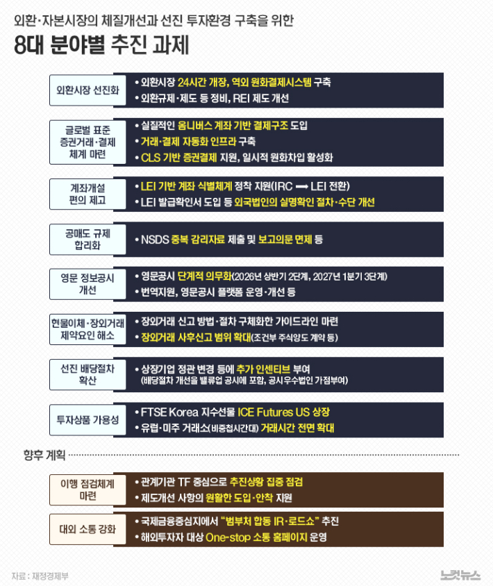 나아가 외국인이 원화를 보다 편리하게 사용할 수 있도록 '원화국제화 로드맵'을 마련하고, 모건스탠리 캐피털 인터내셔널(MSCI) 선진국 지수 편입을 추진해 외환·금융시장 접근성을 개선함으로써 외국인 투자를 적극 끌어들일 계획도 거듭 확인했다.