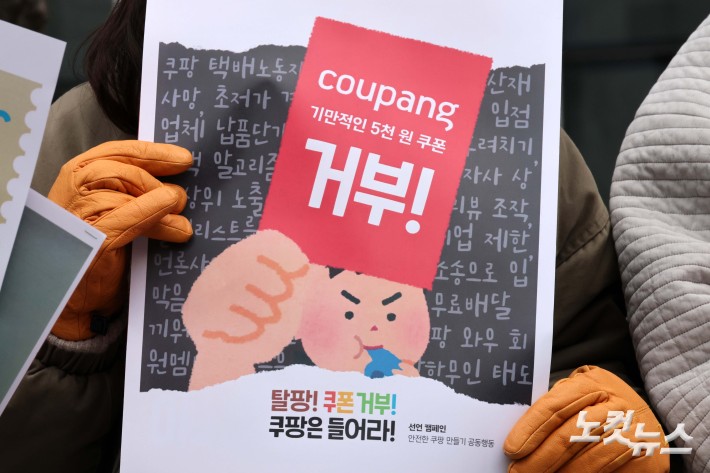 15일 서울 송파구 쿠팡 본사 앞에서 열린 쿠팡 쿠폰 거부 선언 노동계, 중소상인, 종교계, 정당, 소비자, 시민사회단체 공동 기자회견에서 참석자들이 5천원 할인쿠폰을 찢는 퍼포먼스를 하고 있다.