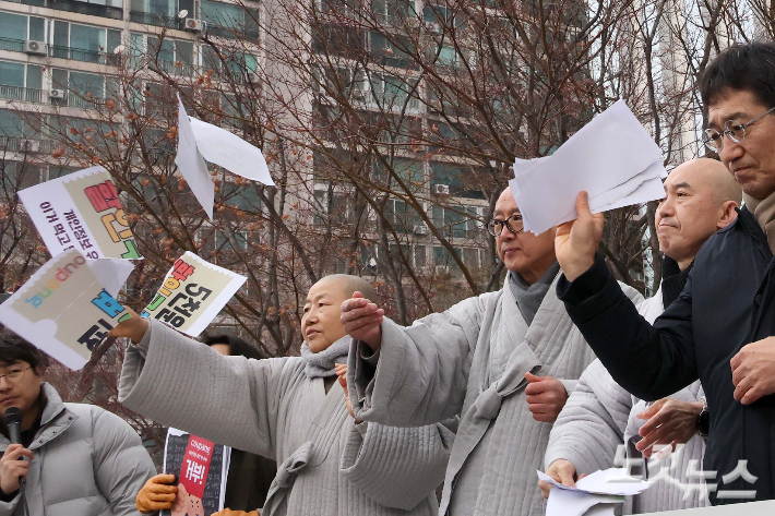 15일 서울 송파구 쿠팡 본사 앞에서 열린 쿠팡 쿠폰 거부 선언 노동계, 중소상인, 종교계, 정당, 소비자, 시민사회단체 공동 기자회견에서 참석자들이 5천원 할인쿠폰을 찢는 퍼포먼스를 하고 있다.
