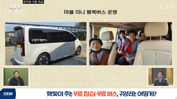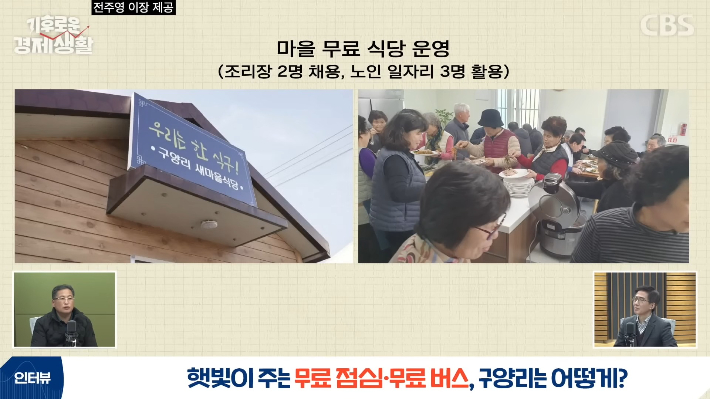 ◇ 전주영> 우선은 사무장을 저희가 고용하고 있거든요. 그래서 사무장 인건비가 나가는 게 있고. 그다음에 마을 미니버스를 무료로 운영하고 있습니다. 사무장이 운전을 하죠. 그리고 저희가 마을 식당은 조리장님을 고용해서 운영하고 있습니다.