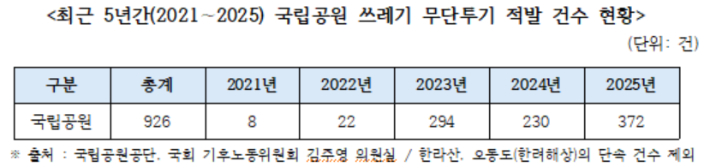 국회 기후에너지환경노동위원회 소속 더불어민주당 김주영 의원이 국립공원공단으로부터 제출받아 18일 공개한 '최근 5년간 국립공원 쓰레기·탐방객 현황'에 따르면, 국립공원 내 쓰레기 무단투기 적발 건수는 2021년 8건에서 자난해 372건으로 약 47배 급증한 것으로 나타났다.