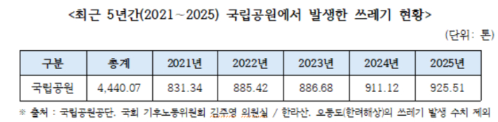 같은 기간 국립공원 내 전체 쓰레기 발생량도 꾸준한 증가세를 보이고 있다. 2021년 831톤이던 쓰레기 발생량은 지난해 925톤으로 약 11.3% 증가했다. 최근 5년간 국립공원에서 수거된 쓰레기의 총량만 무려 4440톤에 달한다.