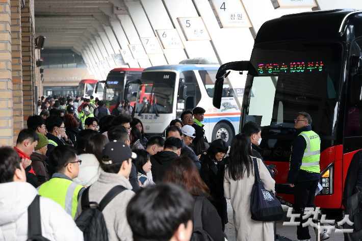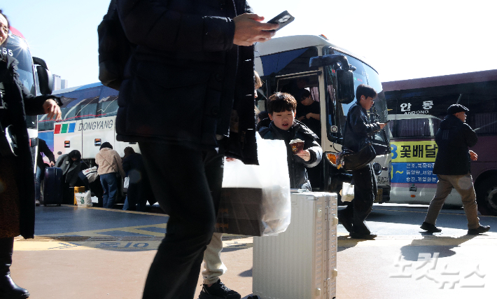 설 연휴 마지막 날인 18일 서울 서초구 강남고속버스터미널에서 귀경객들이 버스에서 내려 귀가하고 있다. 한국도로공사는 교통 혼잡이 오후 3~4시께 정점을 찍은 뒤 오후 11~12시 사이 점차 해소될 것으로 내다보고 있다. 박종민 기자