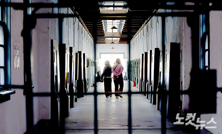 제107주년 3·1절인 1일 서울 서대문구 서대문형무소 역사관을 찾은 시민들이 옥사를 둘러본 뒤 태극기를 흔들며 '대한독립 만세' 를 외치고 있다.