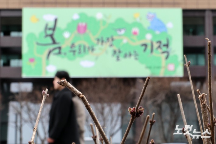 3일 서울 종로구 교보생명 외벽에 김소연 시인의 산문집 '한 글자 사전'에서 가져온 "봄, 우리가 가장 잘 아는 기적"이라는 글귀가 적힌 광화문글판 봄편이 걸려있다. 이번 문안은 봄이 되면 꽃이 피고 새 생명이 다시 자라나는 것을 보며 기적은 멀리 있는 게 아니라 우리 가까이에 있다는 걸 환기해준다. 또 봄을 계기로 일상의 소중함을 되새겨 보자는 메시지를 전한다.