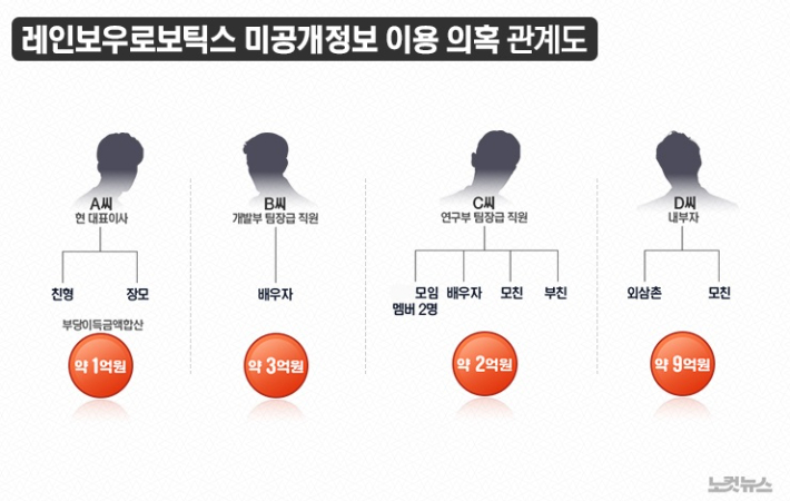 금융당국이 검찰에 접수한 고발장 등에 따르면, 레인보우로보틱스 대표이사 A씨의 장모와 친형은 해당 기간 주요 정보가 공개되기 직전 회사 주식을 사고 팔아 수천만 원에서 1억 원 넘게 이득을 본 것으로 조사됐다. 두 사람은 주요 이벤트 정보 공개 전 매수, 정보 공개 직후 매도하는 매매 양태를 보였는데, A씨로부터 미공개정보를 받아 부정한 거래를 한 의혹을 받고 있다.