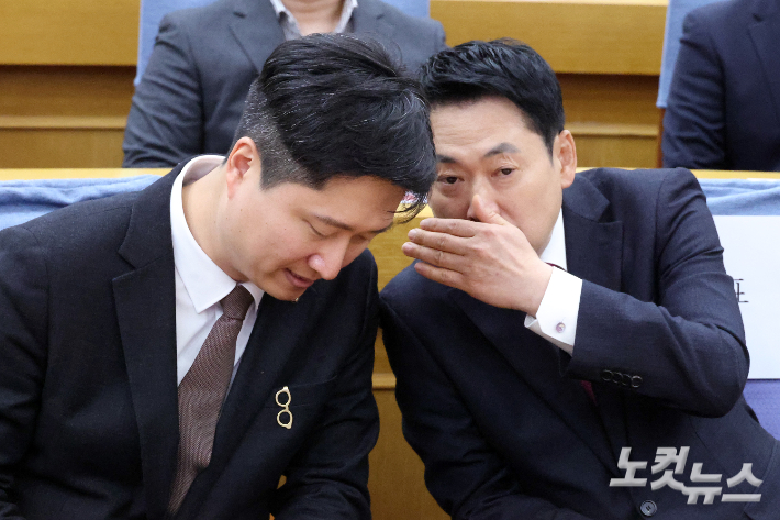 귀엣말하는 장동혁 대표-우재준 청년 최고위원