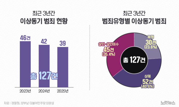 18일 CBS노컷뉴스가 국회 행정안전위원회 소속 더불어민주당 양부남 의원실을 통해 입수한 경찰청 자료에 따르면 최근 3년간 발생한 이상동기 범죄는 총 127건으로 집계됐다. 연도별 발생 건수는 2023년 46건, 2024년 42건, 2025년 39건이다.
