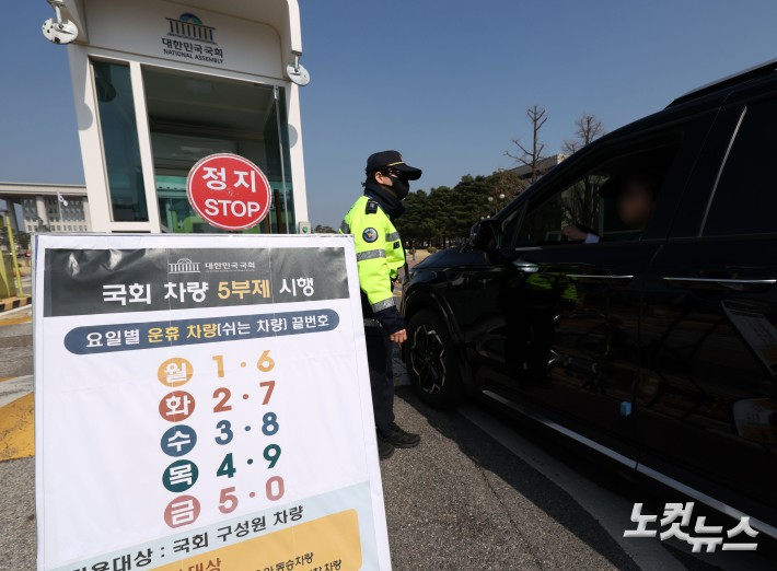 공공기관 차량 5부제 시행 첫 날인 25일 국회 정문에 관련 요일별 운휴차량 끝번호가 안내돼 있다. 중동 사태 장기화 조짐에 정부는 ‘차량 5부제 단계별 시행’ 카드를 꺼내 들었다. 기존 공공부문 5부제를 강화하고, 사태가 악화될 경우 민간 부문까지 단계적으로 확대 적용하는 방안을 검토하겠다는 방침이다.
