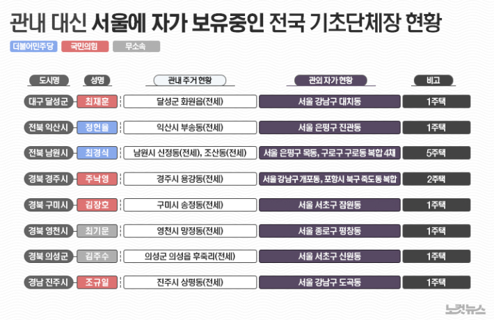 먼저 최재훈 달성군수의 경우 대구 달성군에는 전셋집을 둔 반면 서울 강남구 대치동에 자가 1채를 소유중이다. 최 군수 측은 "배우자가 18년 차 중앙매체 방송기자로 재직 중이라 서울 거주가 불가피하다"며 "연애 시절부터 (배우자가) 거주해온 집이고 현재는 자녀 양육 문제도 겹쳐 있어 서울에 가족이 머물고 있다"고 설명했다. 이어 "(배우자 분의) 향후 직장 상황에 따른 변동 가능성은 열어뒀다"며 "관내로 완전히 거처 옮길 가능성도 있다"고 전했다.