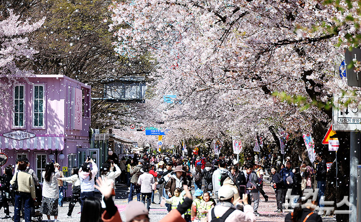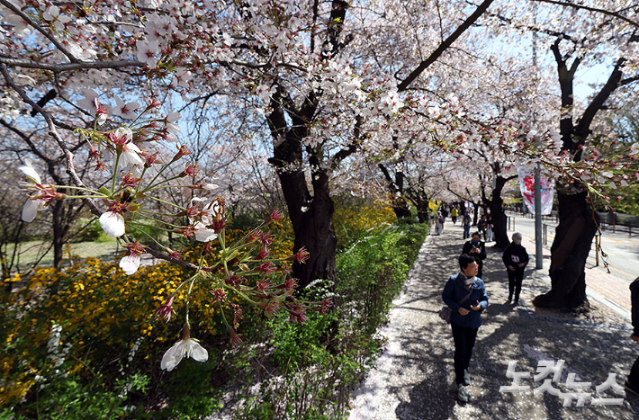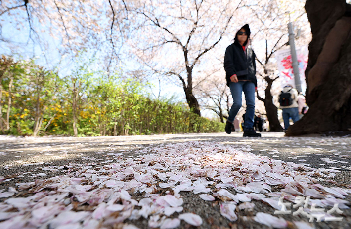 8일 아침 기온이 전국 최저 영하 2도까지 내려가며 꽃샘추위가 찾아온 가운데 서울 여의도 윤중로를 찾은 시민들이 벚꽃잎이 떨어진 길을 걷고 있다.