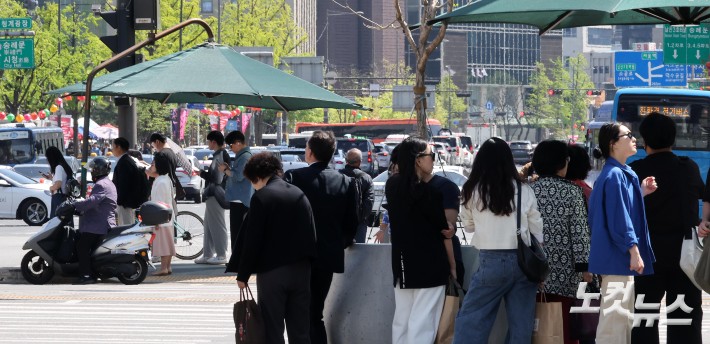 낮 최고기온이 28까지 오르는 등 초여름 날씨를 보인 16일 서울 광화문네거리에서 시민들이 그늘막에서 보행 신호를 기다리고 있다.