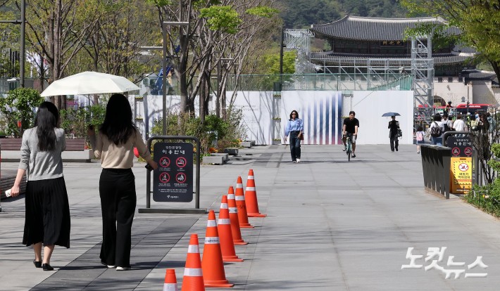 낮 최고기온이 28까지 오르는 등 초여름 날씨를 보인 16일 서울 광화문광장에서 양산을 쓴 시민들이 발걸음을 옮기고 있다.