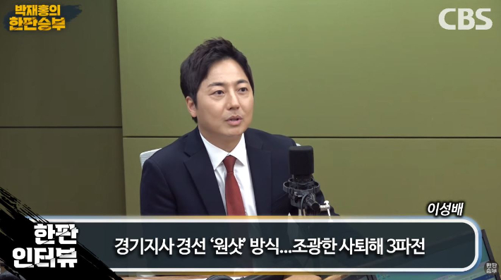 ◇ 박재홍> CBS 박재홍의 한판승부 2부 문을 열었습니다. 어제 국민의힘이 경기지사 예비후보 4명의 원샷 경선을 발표했고 이 경선을 통해 최종 후보를 결정하겠다고 했는데 오늘 조광한 최고위원이 이성배 후보 지지선언을 하면서 사퇴했고요. 3자 구도가 됐습니다. 그래서 이 시간에는 이성배 예비후보를 스튜디오에서 만나서 자세한 말씀 나눠보겠습니다. 후보님 어서 오십시오.