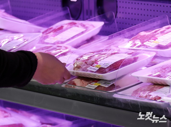 22일 서울 용산구 이마트 용산점에서 시민들이 돼지고기를 구입하고 있다. 농림축산식품부는 중동 정세 불안에 따른 물가 부담을 완화하기 위해 다음 달 말까지 한돈자조금을 활용해 삼겹살과 목살을 전국 8개 대형마트에서 최대 30% 이상, 한돈몰에서 최대 50% 할인 판매한다.