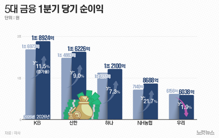 KB·신한·하나·우리·농협금융지주의 1분기 성적표가 나왔다. 5대 금융의 1분기 순이익은 6조1976억원, 지난해 1분기(5조6440억원)보다 5536억원(9.8%) 증가했다. 특히 KB금융(1조8924억원)과 신한금융(1조6226억원), 하나금융(1조2100억원)은 모든 분기를 통틀어 역대 최대 순이익을 기록했다. NH농협금융(8688억원)도 전년 대비 21.7%나 증가한 순이익을 냈다.