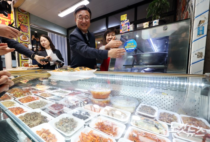 '고유가 피해지원금 사용가능 매장' 스티커 부착하는 행안장관